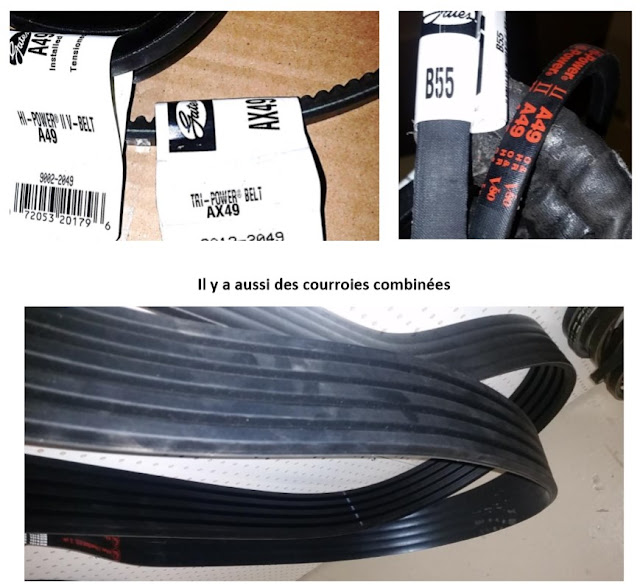 A49 est une courroie de largeur A ayant un diamètre de 49 pouces. AX49 est une courroie de largeur A, dentelée et ayant un diamètre de 49 pouces . B55 est une courroie plus large que A et ayant un diamètre de 55 pouces